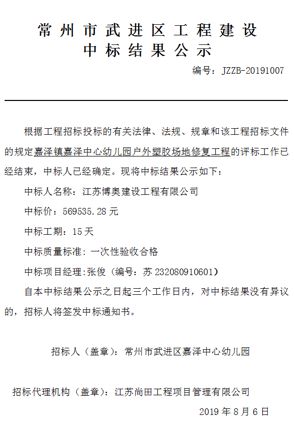 嘉泽镇嘉泽中心幼儿园户外塑胶场地修复工程中标结果公示